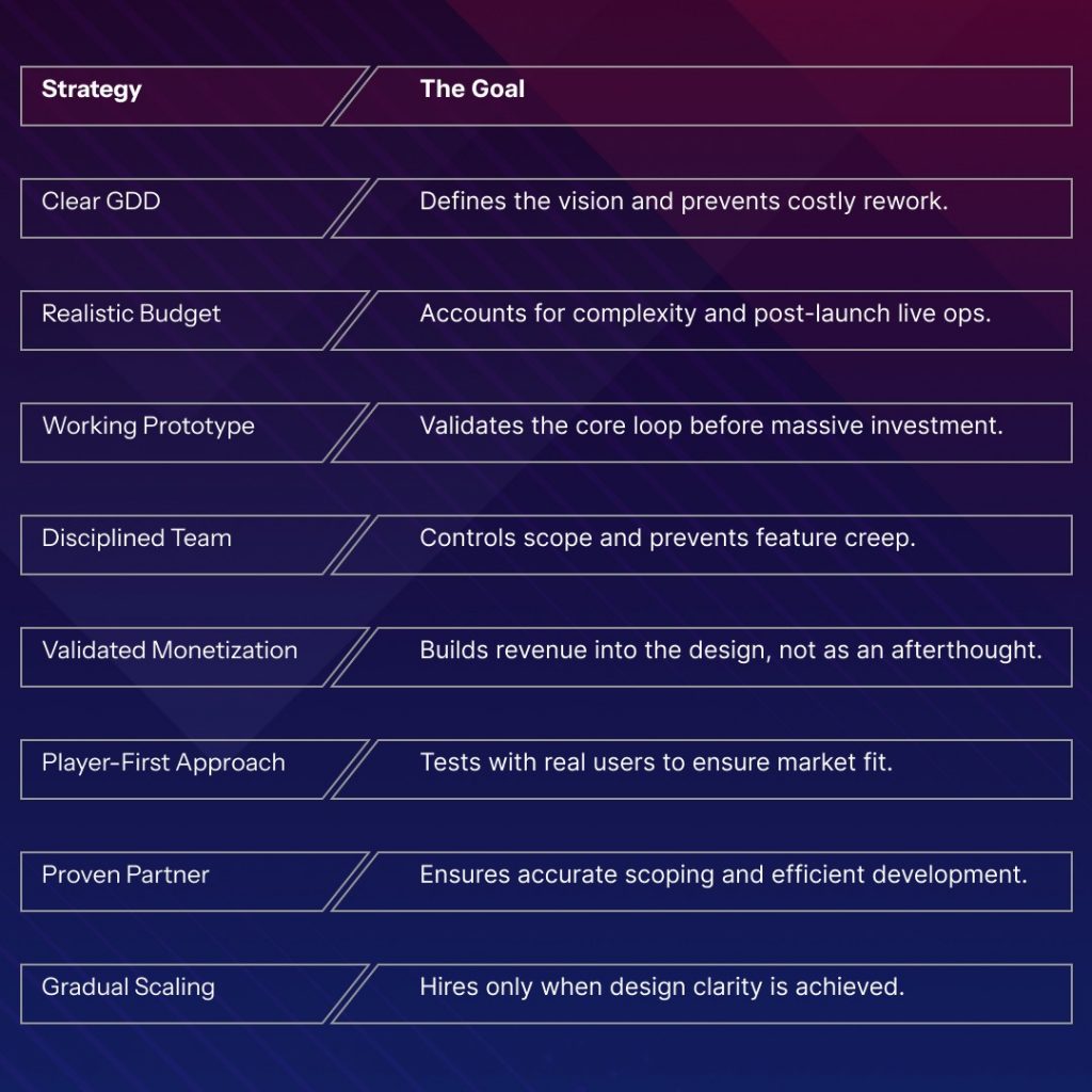 Most startup game companies fail because they rush, assume, overbuild, and underestimate. Your ultimate goal must be the opposite: Plan clearly, build smart, test often, and spend wisely.